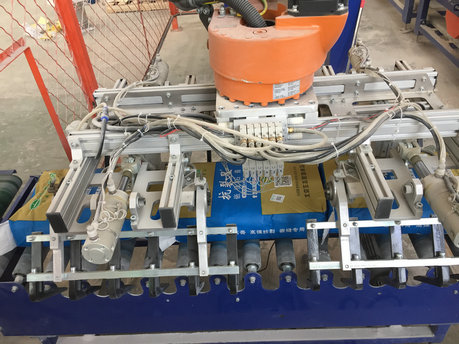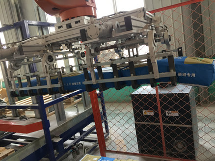將產(chǎn)品通過(guò)進(jìn)料輸送帶輸送進(jìn)料,機(jī)器人及夾具到產(chǎn)品上方,抓取產(chǎn)品后移動(dòng)到棧板位,按事先輸入的碼垛形式進(jìn)行產(chǎn)品碼放,碼放完成后自動(dòng)輸送到纏繞工位,纏繞完成后叉車(chē)運(yùn)走。