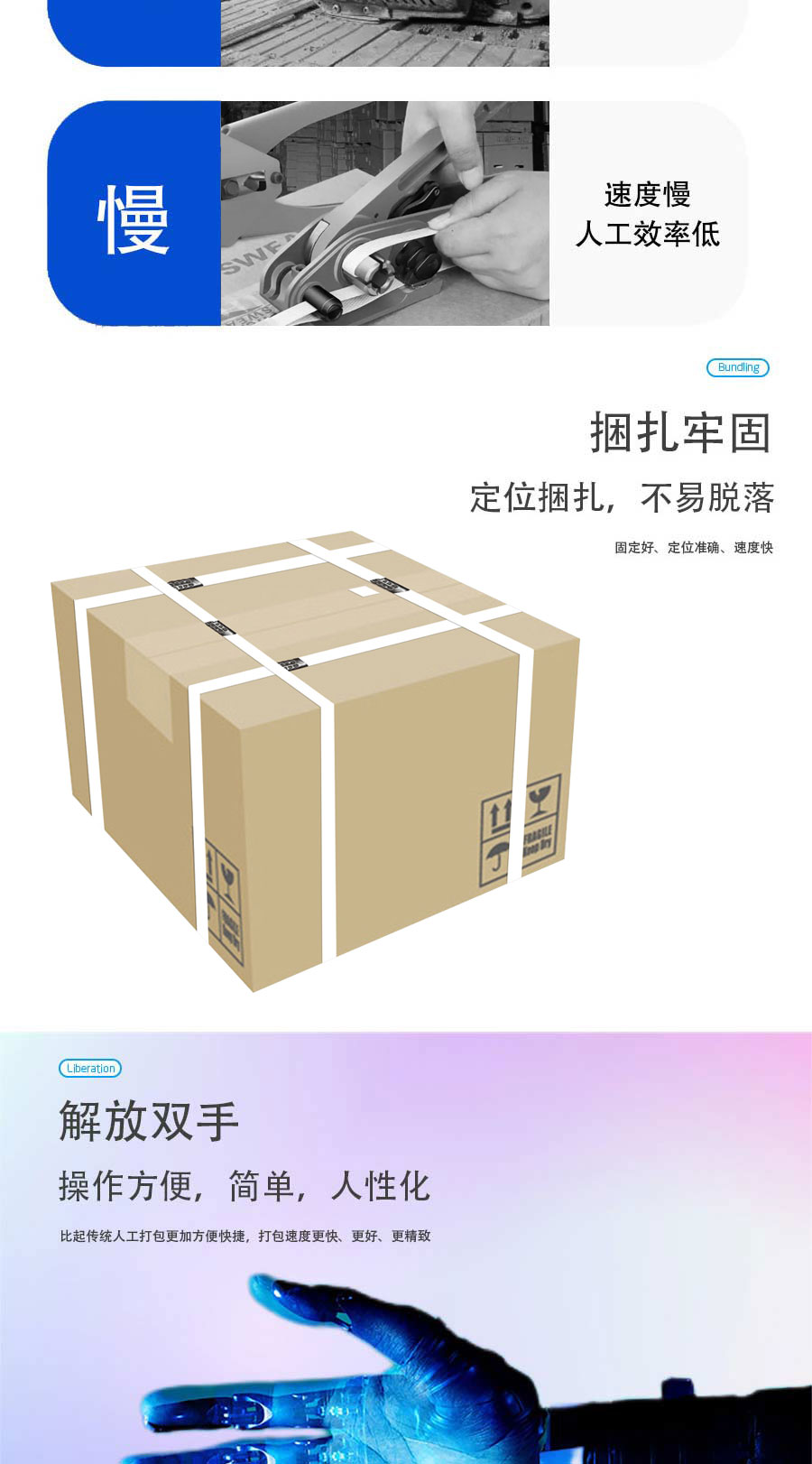 介紹:產(chǎn)品簡(jiǎn)介: 束帶機(jī)能夠使「紙帶」或「透明膠帶」捆包,選用熱熔式粘接,產(chǎn)品捆包簡(jiǎn)潔、美觀。也能夠跟據(jù)生產(chǎn)需要配合輸送帶,實(shí)現(xiàn)無人化捆包。 應(yīng)用行業(yè): 該款打包機(jī)廣泛應(yīng)用于醫(yī)藥、食品、日化以及其他輕工業(yè)等行業(yè)。