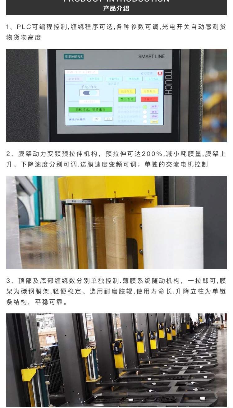 介紹:主要性能 PLC可編程控制,纏繞程序可選,各種參數(shù)可調(diào), 光電開關(guān)自動感測貨物高度 預(yù)拉伸自動送膜機(jī)構(gòu) 轉(zhuǎn)盤緩啟動、緩?fù)V梗詣訌?fù)位 頂部及底部纏繞數(shù)分別單獨控制 自動、手動可切換,幾乎無需日常維護(hù)