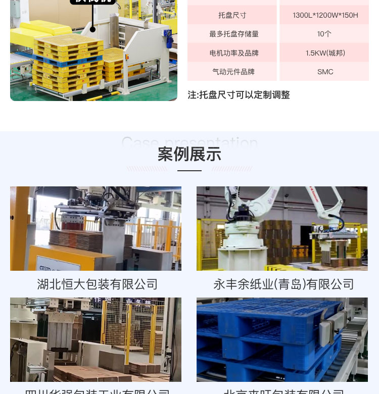 產(chǎn)品簡述:供棧機則是棧板分離機結(jié)構控制棧板掉落在鏈板輸送線上,分離機構成可根據(jù)棧板不同尺寸自動調(diào)整寬度,棧板分離后,經(jīng)由鏈板線輸送至碼垛機器人處。