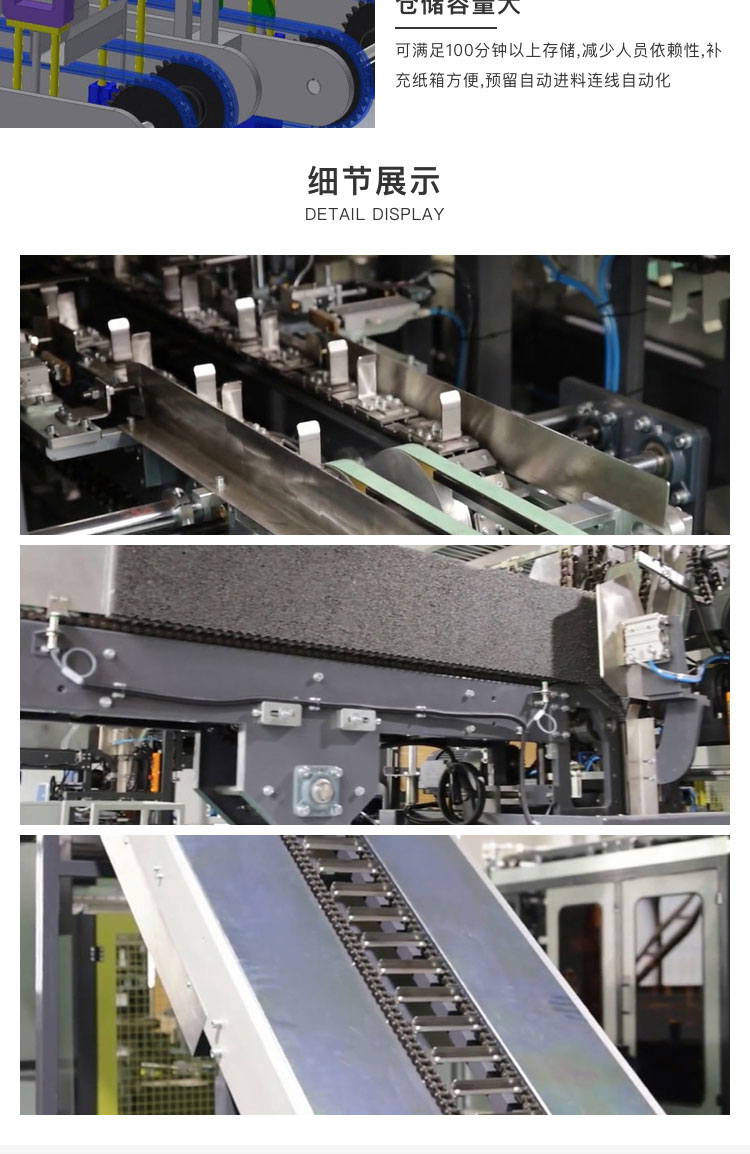 介紹:HW-HT-XH01A采用多吸盤連續(xù)式吸盤吸盒,整機由PLC人機界面控制,采用了鏈排式連續(xù)運動原理,從而保證了高速運行的穩(wěn)定性。依據(jù)客戶對產(chǎn)品所需做聯(lián)機儲備接口。物料通過輸送電機驅(qū)動階梯式機械吸盤動作經(jīng)轉(zhuǎn)輪至裝盒機輸送系統(tǒng)上,并在這個過程中完成進料系統(tǒng)。同時具備檢測功能,并設(shè)有自動調(diào)節(jié)功能使之運行速度能與前段計數(shù)包裝機的生產(chǎn)產(chǎn)能貼切匹配。該設(shè)備可與連續(xù)爐設(shè)備,膜包機,裝箱機等前后道設(shè)備相連接形成一條龍包裝系統(tǒng),滿足企業(yè)生產(chǎn),降低勞動力,節(jié)省包材等效果。