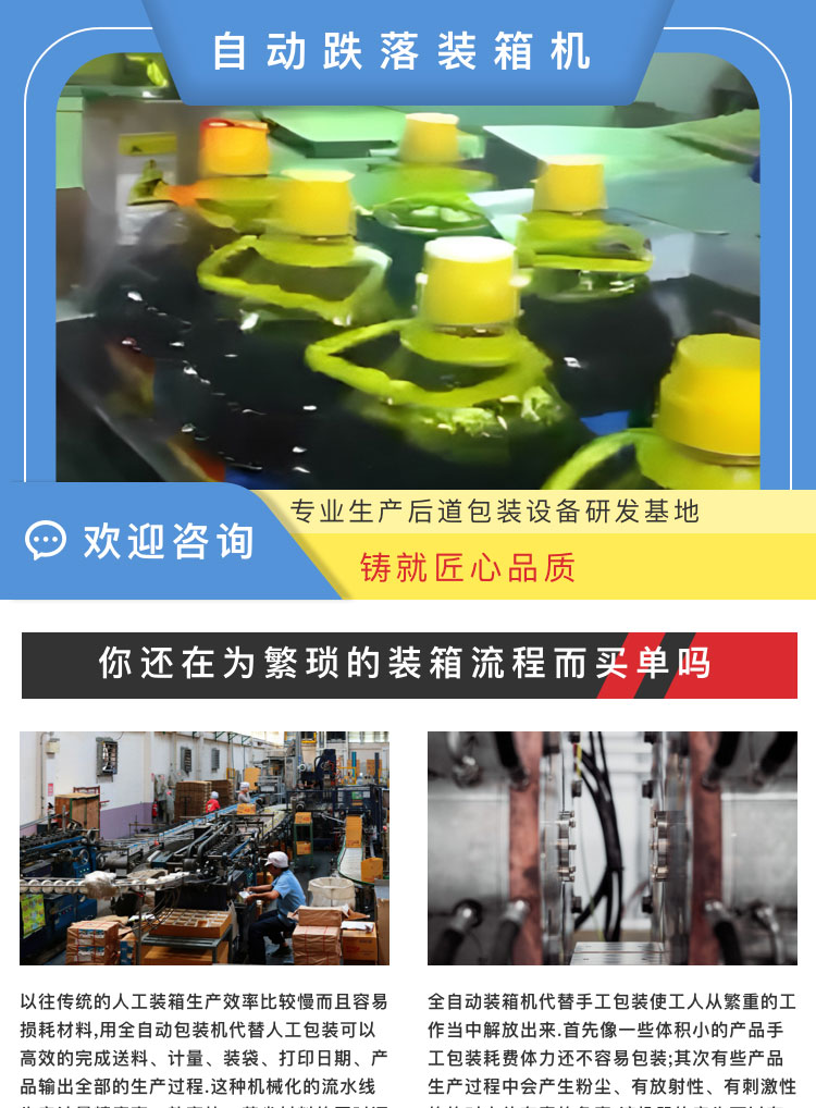 介紹:自動(dòng)跌落裝箱機(jī)。專業(yè)生產(chǎn)后道包裝設(shè)備研發(fā)基地鑄就匠心品質(zhì)。你還在為繁瑣的裝箱流程而買單嗎?以往傳統(tǒng)的人工裝箱生產(chǎn)效率比較慢而且容易損耗材料,用全自動(dòng)包裝機(jī)代替人工包裝可以的完成送料、計(jì)量、裝袋、打印日期、產(chǎn)品輸出全部的生產(chǎn)過(guò)程。這種機(jī)械化的流水線生產(chǎn)計(jì)量精度高、效率快、節(jié)省材料的同時(shí)還減少了人工成本。 全自動(dòng)裝箱機(jī)代替手工包裝使工人從繁重的工作當(dāng)中解放出來(lái)。像一些體積小的產(chǎn)品手工包裝耗費(fèi)體力還不容易包裝;其次有些產(chǎn)品生產(chǎn)過(guò)程中會(huì)產(chǎn)生粉塵、有放射性、有刺激性的的對(duì)人體有毒的危害。該機(jī)器的產(chǎn)生可以的解決這些問(wèn)題。 產(chǎn)品別稱:裝箱機(jī)、裝盒機(jī)、自動(dòng)裝箱機(jī)、自動(dòng)裝盒機(jī)、跌落式裝箱機(jī)、側(cè)推式裝箱機(jī)、抓舉式裝箱機(jī)、機(jī)器人裝箱機(jī)、一片式裹包機(jī)、食用油跌落式裝箱機(jī)。