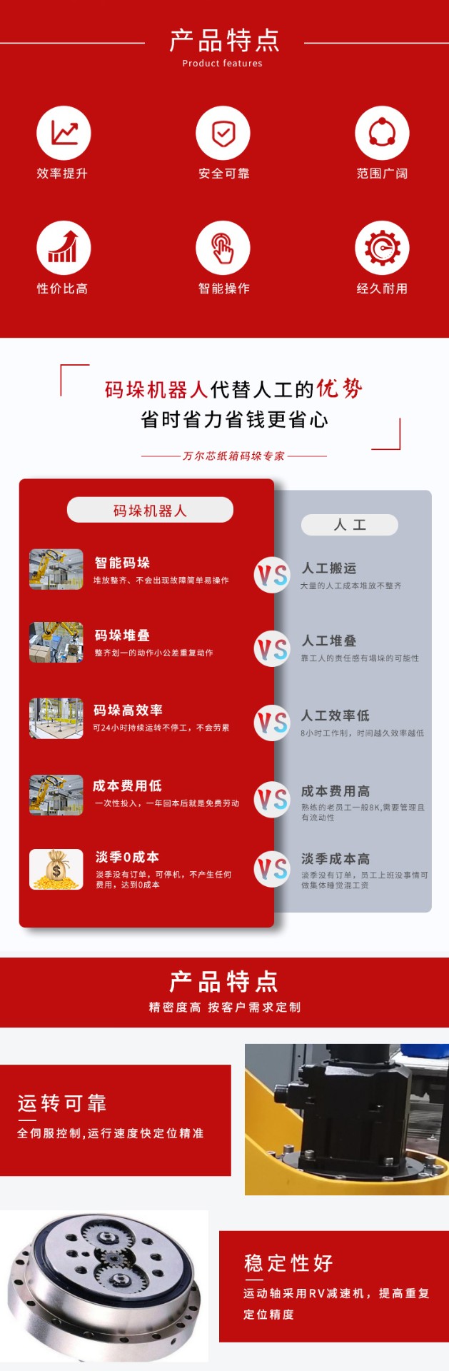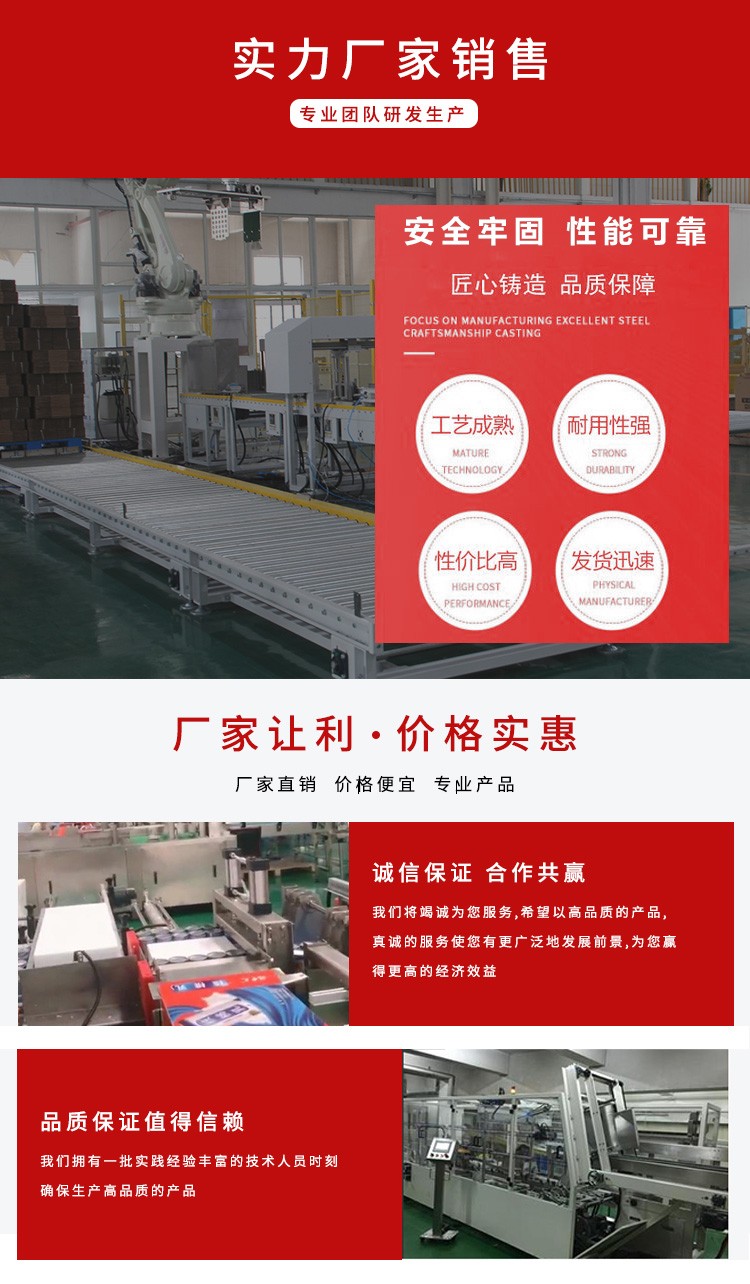 大型機械手碼垛機是一種高度智能化的包裝設備,主要由大型機械手臂、先進的控制系統(tǒng)、傳感器和夾具組成。它具備強大的抓取能力和承載能力,可以自動地完成大規(guī)模產品的抓取、碼垛和放置任務。大型機械手碼垛機通常應用于高產、大批量生產的生產線,可以顯著提升生產效率,降低人力成本,同時保證產品的穩(wěn)定性和包裝質量的一致性。這種機器人碼垛機廣泛應用于各行各業(yè),如物流、汽車、電子、建材等領域,為企業(yè)實現(xiàn)智能化、自動化生產提供了有力支持。其先進的技術和靈活性,使其成為現(xiàn)代化生產線不可或缺的重要設備。
